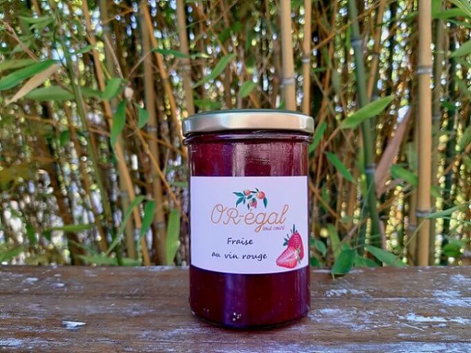 Confiture de fraise au vin rouge (Fabrication artisanale, par petite quantité). Allégée en sucre. Pot de 222 gr